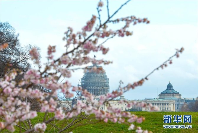 这是12月14日在美国首都华盛顿拍摄的樱花与远处的国会。