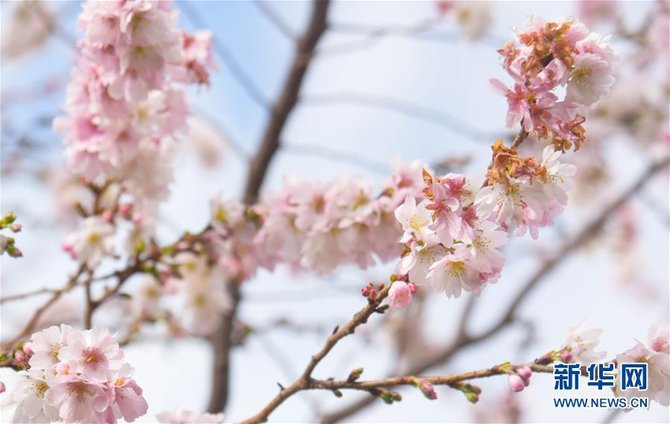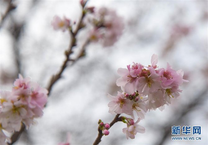 12月14日,在美国首都华盛顿,一只蜜蜂落在了樱花上。