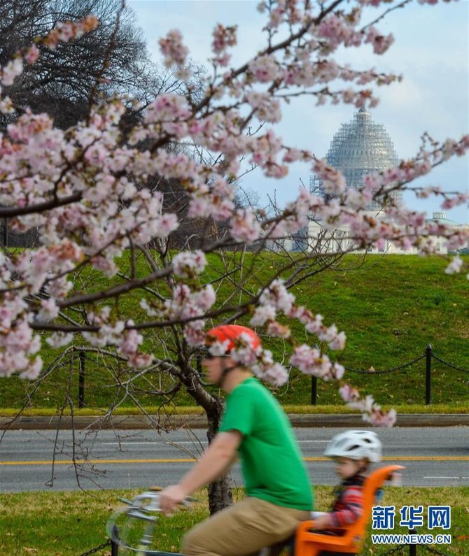 12月14日,在美国首都华盛顿,一位父亲骑车带着孩子经过樱花树。