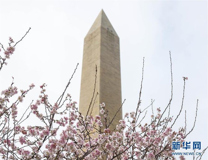 12月14日在美国首都华盛顿拍摄的华盛顿纪念碑前盛开的樱花。