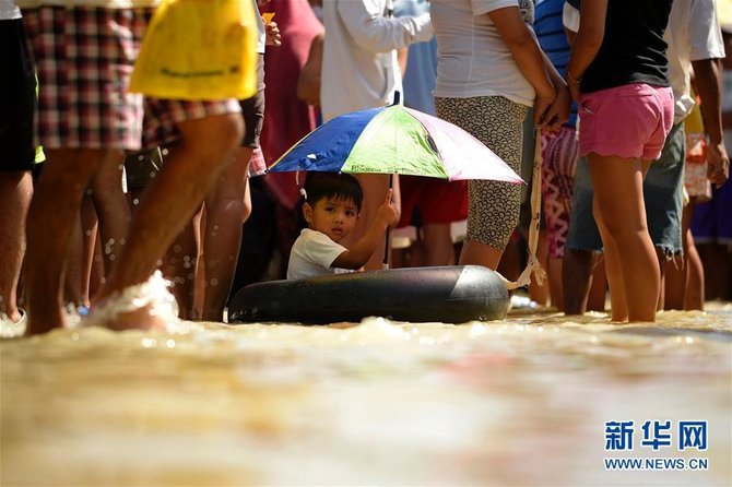 12月24日,在菲律宾马尼拉以北卡伦皮特被洪水淹没的街道上,一个小孩坐在橡皮圈内。近日,台风带来强降水,导致卡伦皮特地区洪水泛滥。对于许多当地居民来说,今年的圣诞节只能在洪水中度过了。 新华社/法新