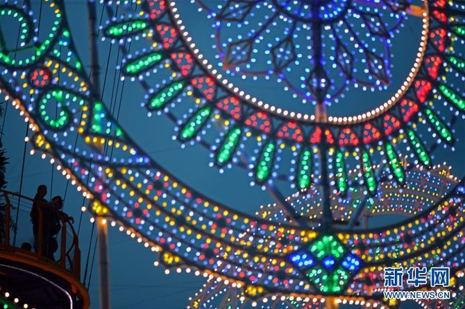这是来自中国四川自贡的“天下华灯”灯会连续第五年在美国举行。今年灯会的举办地选在加州首府萨克拉门托和中部城市图莱里,且首次引入冰上杂技表演。新华社发(刘艺霖摄)