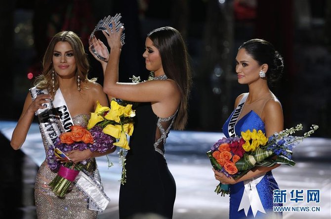 12月20日,在美国拉斯韦加斯举行的2015“环球小姐”总决赛上,上届“环球小姐”、来自哥伦比亚的保利娜·维加(中)将戴在哥伦比亚小姐古铁雷斯头上的桂冠摘下。当日在美国拉斯韦加斯举行的2015“环球小姐”总决赛上,2015菲律宾小姐武茨巴赫最终摘得桂冠。然而在此之前,2015哥伦比亚小姐古铁雷斯被错误地宣布为冠军。新华社/美联