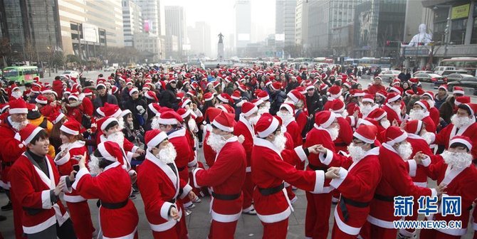 12月24日,数百名“圣诞老人”在韩国首尔光化门广场上跳舞。当日,在韩国首尔,数百名志愿者身着圣诞老人装束现身光化门广场。他们将为1004名首尔的儿童送去爱心圣诞礼物。 新华社记者姚琪琳摄