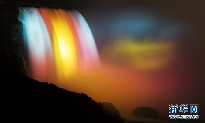 12月25日,在尼亚加拉瀑布加拿大一侧,彩灯照射下的瀑布如梦如幻。当日是圣诞节,适逢加拿大尼亚加拉瀑布景区举办2015年冬季彩灯节,绚烂的彩灯将节日的夜空点缀得耀眼夺目,吸引了众多游人前来观看。新华社发(邹峥摄)