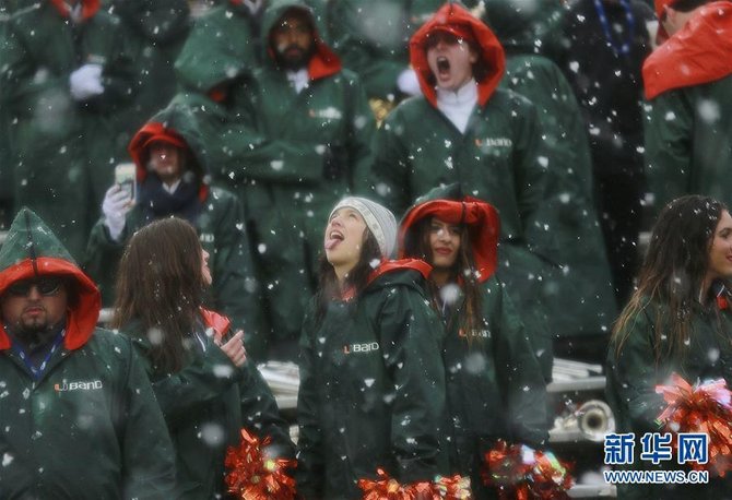 12月26日,在美国得克萨斯州埃尔帕索举行的一场大学生橄榄球赛间隙,一名拉拉队队员伸出舌头迎接从天而降的雪花。 新华社/美联