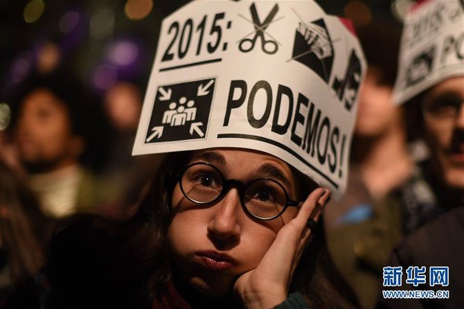 12月20日,在西班牙首都马德里,一名我们可以党的支持者在等待选举结果时做鬼脸。西班牙副首相索拉娅·萨恩斯·德圣玛丽亚在20日晚举行的新闻发布会上宣布,执政党人民党在当天的大选中获得多数选票,但没有赢得议会绝对多数,不能独立执政。新华社/法新
