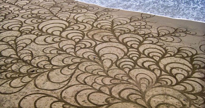 迄今为止,他一共创作过9290平方米的画作。但并没有一幅作品留下来。每当他作完一幅画的几个小时内,潮水、海风都会吞噬他的作品。有时几分钟内。有时他一边创作,一边被吞噬。