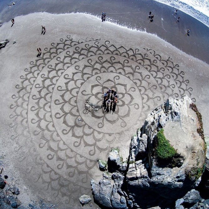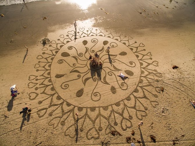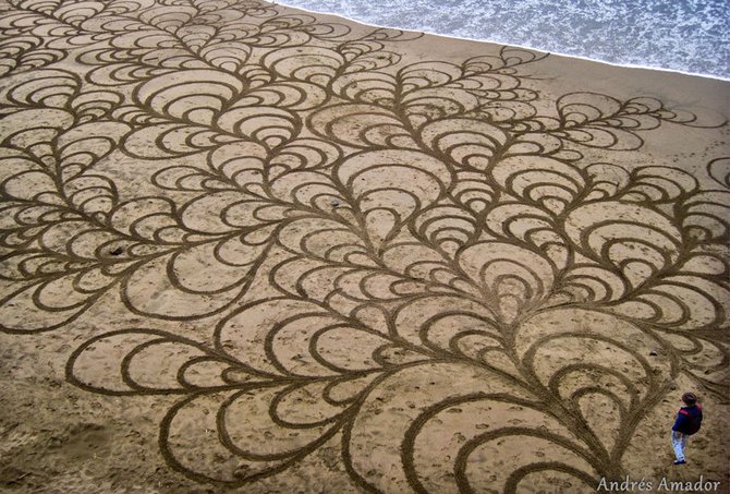他叫Andres Amador,来自旧金山的,是一名沙画作家。不同于许多把沙当作“笔”和“颜料”的沙画作家,Amador把沙当作底板,所以他的作品都非常大,真的非常大……