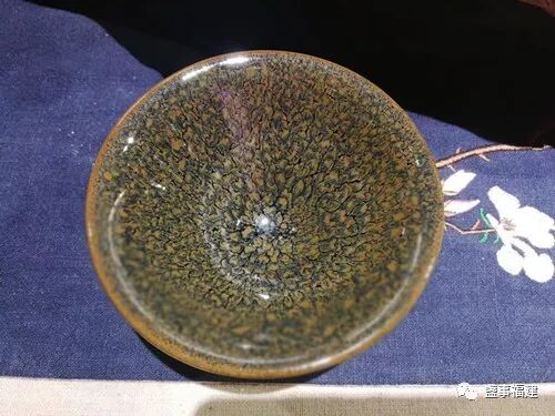 建盏气孔是高温中胚体的铁析出,加入的油柴让窑炉内产生了一氧化碳,然后析出的铁开始转换,变成小斑,慢慢地小斑凝聚在一起,最终形成了大斑。