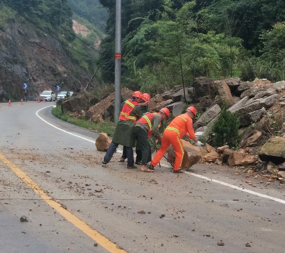 27日8时,路政员对该路段实行交通管制,封闭前后两端交通。在场所有人员做好安全防护措施后,由两名“蜘蛛人”从高处的大岩石开始挖撬,利用铁锹、锄头等工具逐个对易溜岩石周边进行松土处理。