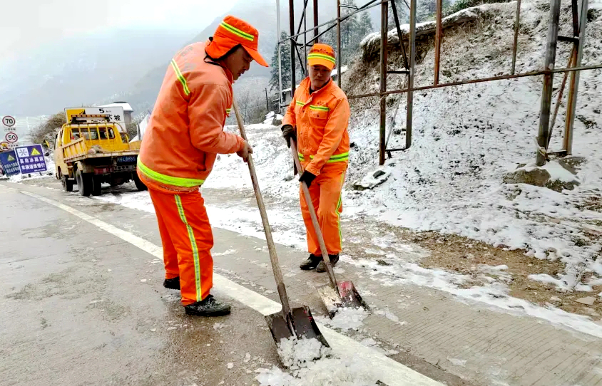 洋庄公路站养护工们及时在路上设立警示标志,并采用撒融雪剂和人工清除的方式清除路面积雪,预防路面结冰,最大限度减少雨雪天气对道路安全带来的影响。